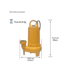 Bomba Centrífuga Submersível - Rotor semiaberto tipo Vortex Motor Trifásico 220v refrigerado a óleo hidráulico em II Polos, 60Hz, 3500rpm - Bocal com rosca BSP 3". Utilizada para drenagem de água com sólidos no diâmetro máximo de 45cm não fibrosos OBS.: Não utilizar em água potável devido ao óleo hidráulico. Carcaça, camisa e grade em ferro fundido GG-20. Rotor em ferro fundido GG-20. Anéis de vedação em Buna N. Selo mecânico: Faces em grafite e cerâmica. Mola em inox 304 e elastômero (borracha) em Buna N.