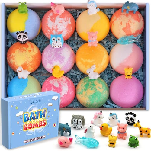 SANTRELA Bombas de banho com brinquedo surpresa no interior – Existem 12 brinquedos surpresa diferentes em cada bola de bomba, que serão revelados quando os brinquedos estiverem prontos! - Estas bombas de banho são colorantes, mas não vão manchar sua banheira ou pele. 12 aromas exclusivamente trabalhados: Manga – humor claro, Laranja doce – Sensação boa, Baunilha – Refresque o cérebro, Oceano – Aproveite a vida, Morango – Bom dia, Maçã verde – remove o cansaço, Lavanda – desenrola a mente, Camomila – hálito livre, Eucalipto – Acalma os músculos, Rosa – Sweet Dreams, Limão – A Good Heart, Coco. Aproveite todos os dias. Bolhas coloridas e brilhantes, cheiros encantadores e brinquedos surpresa podem ajudar seus filhos a se apaixonar pelo banho. Os ingredientes calmantes na bomba de banho podem relaxar seus filhos, adequado para crianças com mais de 3 anos de idade Livre de crueldade e humano: Nunca experimentaremos animais – não precisamos porque nada tóxico ou prejudicial entrará em nossos produtos. - ?BOMBAS DE BANHO COM SURPRESA INTERNA ?Existem diferentes brinquedos surpresa em cada bola bomba, que serão revelados quando os brinquedos assobiarem! Hora do banho misteriosa e surpreendente, faça seu filho se apaixonar pelo banho. - ?12 sabores diferentes?Jogue uma bomba de banho infantil na água e observe-a assobiar, criando cores mágicas. Pacote com 12 aromas: oceano, eucalipto, manga, maçã verde, laranja doce, lavanda, limão, baunilha, morango, camomila, rosa, coco. - ?Ingredientes 100% seguros?Feito com ingredientes seguros e suaves para garantir que sejam seguros para crianças e manter sua pele hidratada. A cor engraçada não deixa manchas ao redor da banheira e é fácil de limpar. Sem manchas na banheira. - ?Aproveite a hora do banho divertido?Bolhas coloridas e brilhantes, cheiros encantadores e brinquedos surpresa podem ajudar seus filhos a se apaixonarem pelo banho. Os ingredientes calmantes na bomba de banho podem relaxar seus filhos, adequados para crianças com mais de 3 anos de idade. - ?Ideal para presente: nossos conjuntos de presentes de banho e trabalho corporal usam ingredientes da melhor qualidade, portanto, sinta-se à vontade para usá-los. O lindo conjunto de presente é perfeito para aniversários, Natal e ovos de Páscoa, presentes de festa e outras ocasiões, perfeito para meninos e meninas.