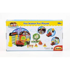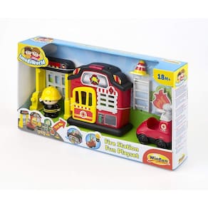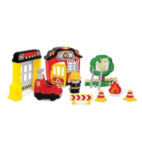 Inclui estação de bombeiros, bombeiro, caminhão de bombeiros, escada de incêndio, porta fechada e móvel, árvore, gato, fogo (faz de conta), sinais e cones