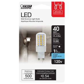 Bombilla LED Feit Electric G9 regulable, equivalente a 40W, 500 lúmenes, luz de día T4 que reemplaza halógenas para candelabros, luces de tocador o lámparas de escritorio, modelo BPG940/850/LED. - 5000K - LUZ DE DÍA - REGULABLE - 5.5 cm de altura x 2.0 cm de diámetro - Encendido instantáneo al brillo máximo con rendimiento relativamente fresco. - Eficiencia energética: hasta un 89% menos de consumo comparado con bombillas incandescentes estándar. - Uso: Candelabros y decorativo