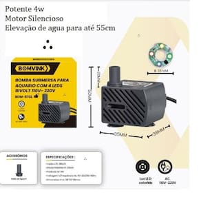 Com uma vazão REGULAVÉL de ATÉ 180L/h e iluminação LED integrada, essa bomba é perfeita para quem busca eficiência, Economia e estilo em pequenos aquários e fontes decorativas e inclusiva fonte para pets e hidroponia .