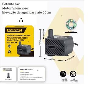 Bombinha Para Aquário fontes e bebedouros de pet 4w 160L/h Transforme seu aquário em um ambiente saudável e iluminado com a Bomba Submersa BOMVINIK MODELO 8702 com LED COLORIDO Com uma vazão REGULAVÉL de ATÉ 180L/h e iluminação LED integrada, essa bomba é perfeita para quem busca eficiência, Economia e estilo em pequenos aquários e fontes decorativas e inclusiva fonte para pets e hidroponia . Compacta apenas 3.8cm X 3.0cm X 3.5cm Fixação 3 ventodas incorporadas. Sem surpressas bivolt automatico, baixo ruido para categoria e potencia. Operando de forma silenciosa e consumindo apenas 4W, oferece circulação de água contínua e uma estética atraente. Sua luz LED realça o ambiente aquático, destacando a beleza dos peixes e plantas com um toque moderno. Além disso, a bomba possui regulagem de vazão, permitindo que o fluxo de água seja ajustado conforme a necessidade. Observações Importantes: A bomba deve estar totalmente submersa para funcionar corretamente. Na primeira operação certifique-se que não exista ar dentro da bomba Certifique-se de escolher a voltagem adequada 110V ou 220V para sua instalação. e Qualidade: Acompanha Marca: Não Informado