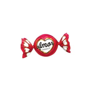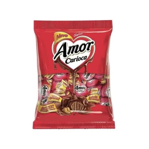 Bombons Amor Carioca com recheio de castanha-de-caju com cobertura sabor chocolate ao leite com 20 gramas cada. Pacote contendo aproximadamente 45 unidades. Peso líquido total 900 gramas.