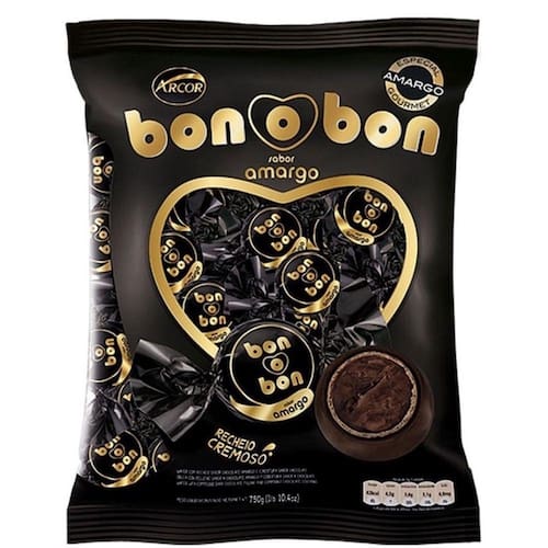 Pacote contendo aproximadamente 50 unidades de Bombom com recheio sabor chocolate meio amargo coberto com chocolate meio amargo com 15 gramas cada. Peso total da embalagem 750g.