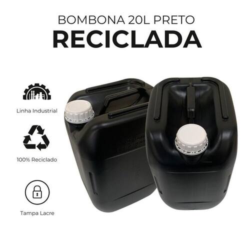 Bombona 20 litros reciclada preta com tampa lacre branca e alça incorporada - 2 peças Nesta compra você vai receber: 02 x bombonas pretas 20 litros com tampa lacre branca Importante: Este produto é fabricado com material reciclado e não é indicado para o envase de alimentos ou líquidos para consumo humano. A bombona de 20 litros reciclada preta da nastripack é a escolha inteligente para quem busca economia, durabilidade e consciência ambiental, agora com todas as informações técnicas que você precisa. Fabricada com plástico reciclado pead de alta qualidade, esta bombona oferece uma solução robusta e versátil para suas necessidades de armazenamento e transporte. Com sua cor preta, a bombona garante maior proteção contra a luz para conteúdos sensíveis, além de um visual discreto e para diversos ambientes industriais e comerciais. O bocal de rosca 63mm - autolacrável com disco vedante assegura um fechamento firme e à prova de vazamentos, protegendo o conteúdo e facilitando o manuseio e o reuso. Características principais: Capacidade: 20 litros, ideal para uso doméstico, industrial e comercial. Cor preta: protege o conteúdo contra a luz, ideal para líquidos sensíveis. Material reciclado resistente: alta durabilidade e resistência a impactos. Tampa com fechamento seguro, evitando vazamentos e contaminação. Design prático e fácil de transportar. Capacidade e dimensões: Capacidade volumétrica nominal: 20 l Capacidade volumétrica total of : 21,8 l Dimensões altura. X largura. X comprimento : 388 x 240 x287 mm Gramatura utilizada: 900 grs +/- 30g É ideal para envasar e armazenar: Água para fins não potáveis jardinagem, limpeza, construção Detergentes e produtos de limpeza Lubrificantes e óleos industriais Insumos agrícolas Outros líquidos e granulados verificar compatibilidade Vantagens da bombona 20 litros reciclada preta nastripack: Econômica: ótimo custo-benefício. Sustentável: reduz o impacto ambiental. Resistente: feita para durar e suportar o uso diário, com gramatura de 1000g. Vedação superior: bocal com rosca autolacrável e disco vedante. Versátil: ideal para diversas aplicações não alimentícias. Versatilidade de aplicações: o que a bombona 20 litros pode envasar A bombona 20 litros reciclada preta da nastripack é uma solução excepcionalmente versátil para diversos segmentos. Suas principais aplicações incluem: Indústria de limpeza e higiene: ideal para concentrados de detergentes industriais, desinfetantes de uso geral, amaciantes, sabão líquido para lavanderias profissionais, produtos para limpeza automotiva e saneantes para grandes ambientes. Setor industrial: armazenamento e transporte de óleos lubrificantes, fluidos hidráulicos, aditivos para máquinas, ceras, colas compatíveis com pead , emulsões e outros insumos não alimentícios. Agricultura e jardinagem: perfeita para fertilizantes líquidos solúveis em água, verificar compatibilidade , com as devidas precauções de segurança , e água para irrigação de pequenos cultivos ou canteiros. Construção civil: transporte de água para misturas de argamassa, aditivos para cimento, ou para a lavagem de ferramentas e equipamentos no canteiro de obras. Uso geral e coleta: excelente para coletar e transportar água da chuva, óleos cozinha ou motor , resíduos líquidos não perigosos para descarte adequado, ou como recipiente para armazenamento de ferramentas e pequenos objetos. Importante: Este produto é fabricado com material reciclado e não é indicado para o envase de alimentos ou líquidos para consumo humano. Trata-se de um produto plástico, sendo essencial transportar e armazenar em local fresco e ventilado, longe de calor, poeira e raios solares para garantir sua durabilidade e integridade. Invista na bombona 20 litros reciclada preta da nastripack e combine praticidade, economia e respeito ao meio ambiente em um só produto Bombona preta,bombona nastripack,bombona preta nastripack,bombona preta 20l.