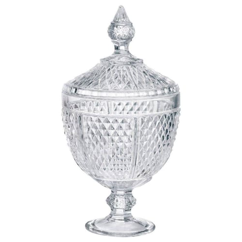 Pote Bomboniere de Cristal com Pé Perseu 28,5x15cm Lyor As bombonieres com tampa são modelos clássicos e muito versáteis, já que podem ser colocados em diferentes ambientes, sempre oferecendo aquele toque de descontração e sabor que somente um refratário com doces pode garantir. A Bomboniere Perseu da Lyor foi pensada exatamente pra deixar seu ambiente mais doce e dar um charme na sua decoração. - Material: Cristal. - Medidas (Axø): 28,5cm x ø15cm. - Peso unitário: 1,455kg. - Tamanho da embalagem (AxLxP): 21cm x 15,5cm x 15,5cm.