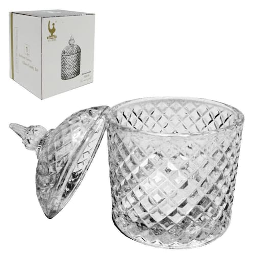 Bomboniere de vidro relevo com tampa 14x9,5cm de na caixa Ean: 7898702290385 Validade: indeterminada Tamanho aproximado da bomboniere: 14x9,5cm de Tamanho aproximado da caixa: a:11,5xl:10,5cm Peso aproximado: 565g Tipo de produto: bomboniere relevo com pé e tampa na caixa Cor: transparente Composição: vidro Ean: 7898702290385