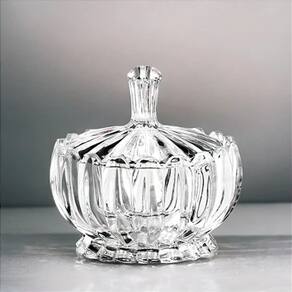 Confeccionado em vidro, com detalhes bem trabalhados e tampa, a bomboniere possui medidas de 11cmx11cmx10,5cm, sendo pequena e perfeita para pequenos espaços e até mesmo fazer um jogo com diversas peças dela.