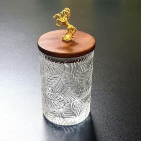 Bomboniere potiche vidro baleiro tampa madeira 13x9 Cor: incolor Confeccionado em vidro lapidado incolor, o potiche bomboniere com tampa em madeira e lindo adereço com um cavalo em metal dourado esbanja elegância