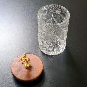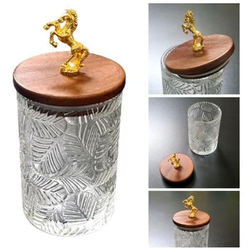 Bomboniere potiche vidro baleiro tampa madeira 13x9 Cor: incolor Confeccionado em vidro lapidado incolor, o potiche bomboniere com tampa em madeira e lindo adereço com um cavalo em metal dourado esbanja elegância