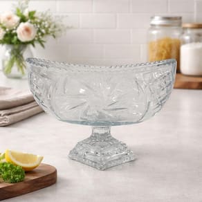 Com design clássico e detalhes em relevo, a peça possui acabamento refinado, bordas delicadamente trabalhadas e base com pé que proporciona imponência e estabilidade. Ideal para servir balas, bombons, doces finos ou até mesmo para compor a decoração com flores secas e arranjos.