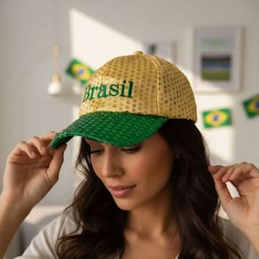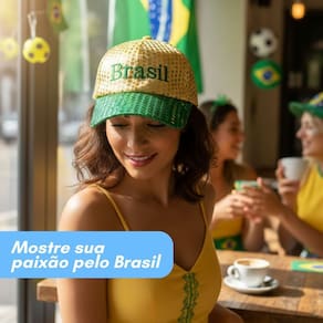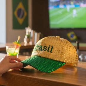 O Boné do Brasil com Lantejoulas Verde e Amarelo é um acessório para quem quer torcer com estilo, destaque e muito brilho. Use durante os jogos da Seleção Brasileira, festas temáticas, eventos esportivos ou em comemorações patrióticas. Com acabamento em cetim, aplicação de lantejoulas brilhantes e estrutura em poliéster resistente, ele une conforto, ajuste de tamanho e impacto visual. Características- Tamanho único- Fechamento regulável em fecho por contato- Ajuste fácil para diferentes tamanhos de cabeça- Leve e confortável para uso prolongado- Material: Cetim, lantejoula e poliéster- Cor: Verde e amarelo- Tamanho da Aba: 16cm x 7cm- Altura: 12cm- Diâmetro: 18cm- Tamanho: Único com regulagem em fecho por contato