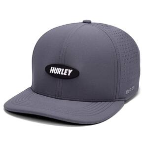 Boné Hurley H20-DRI, tecido leve com respirabilidade, aplique frontal de metal, perfuração a laser nas laterais, heat transfer lateral refletivo, regulador traseiro e etiqueta bandeira ONE&ONLY.