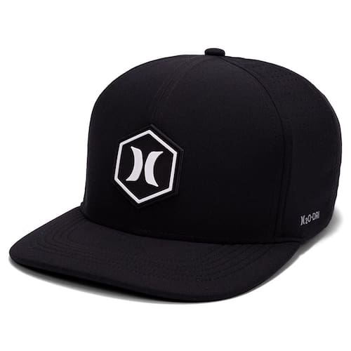 Boné Hurley H20-DRI, tecido leve com respirabilidade, patch frontal de borracha, heat transfer lateral refletivo, bordado na parte traseira, regulador traseiro e etiqueta bandeira ONE&ONLY.