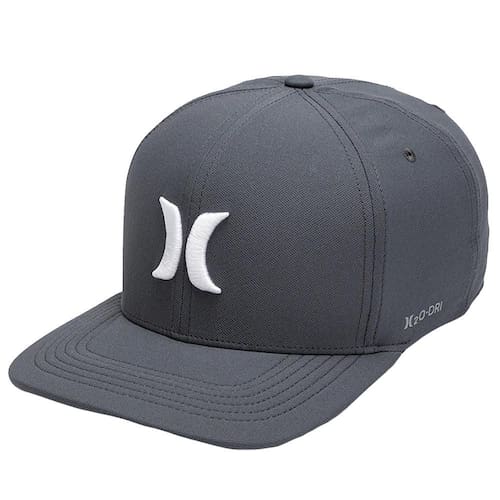 Boné Hurley H20-DRI, tecido leve com respirabilidade, bordado ICON 3D, heat transfer lateral refletivo, regulador traseiro e etiqueta bandeira ONE&ONLY.