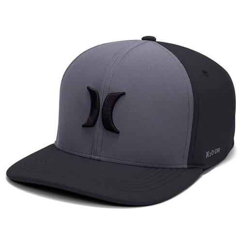 Boné Hurley H20-DRI, tecido leve com respirabilidade, bordado ICON 3D, heat transfer lateral refletivo, regulador traseiro e etiqueta bandeira ONE&ONLY.