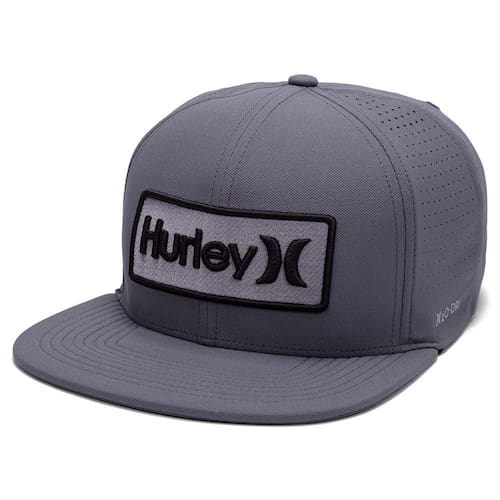 Boné Hurley H20-DRI, tecido leve com respirabilidade, patch frontal bordado, perfuração a laser nas laterais, heat transfer lateral refletivo, regulador traseiro e etiqueta bandeira ONE&ONLY.