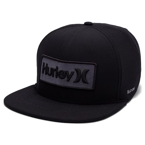 Boné Hurley H20-DRI, tecido leve com respirabilidade, patch frontal bordado, perfuração a laser nas laterais, heat transfer lateral refletivo, regulador traseiro e etiqueta bandeira ONE&ONLY.
