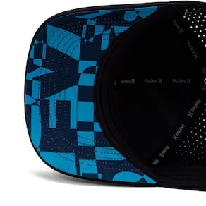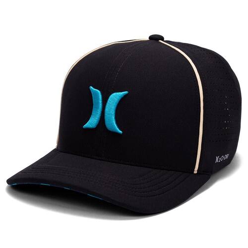 Boné Hurley H20-DRI, tecido leve com respirabilidade, bordado ICON 3D, perfuração a laser nas laterais, viés frontal, aba inferior sublimada, heat transfer lateral refletivo, regulador traseiro e etiqueta bandeira ONE&ONLY.