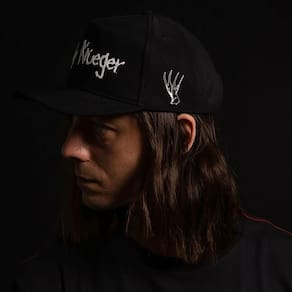 Boné MCD aba curva, com estampa frontal freddy krueger em alto relevo no centro, bordado espada do lado do fecho, etiqueta core caps costurada no elástico nas laterais, ottoman, fita interna personalizada MCD Flexfit e estampa silk zero toque na lateral inferior da aba.