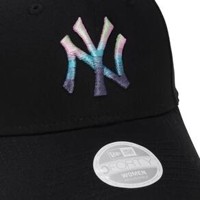 - Detalhamento: Boné de modelagem feminina na cor preta, composto por seis gomos sendo os dois frontais estruturados, bordado frontal com logo do time da MLB "New York Yankees" em alto relevo metálido brilhante e colorido, logo da New Era bordado no mesmo estilo na lateral esquerda, aba curva flexível, fecho traseiro strapback ajustável;