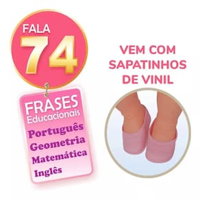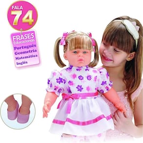 - Características: • Boneca fala 74 frases educacionais português geometria matemática alfabeto e inglês • Tamanho aproximado da boneca de 55 cm de altura e 37 de largura • Composição: Vinil e Tecido • Abre e Fecha os olhinhos • Acompanha lindos sapatinhos e chupeta • Marca: Adijomar • Recomendado para crianças a partir de 3 anos de idade • Código de Barras: 7897020203909