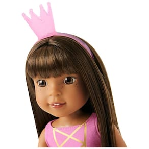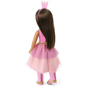 Boneca Ashlyn de que tem o tamanho certo para meninas mais novas. Ela tem olhos castanhos, bochechas sardentas e longos cabelos castanhos sedosos que podem ser escovados e penteados. Um collant rosa pétala com laço metálico dourado estampado na frente. Uma saia removível com glitter rosa com bainha alta e baixa e cós elástico com glitter dourado e laço. Uma tiara rosa com uma verdadeira coroa de princesa e uma cueca rosa claro. Um par de botas galochas cor de rosa que parecem Mary Janes douradas brilhantes Marca: Não Informado