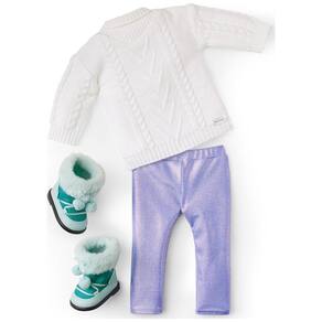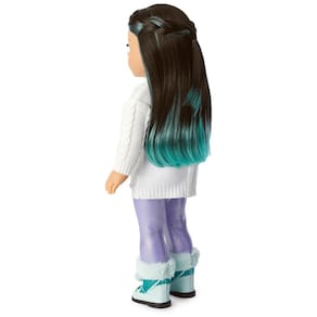 A boneca Corinne de em olhos castanhos e cabelos pretos longos e lisos com camadas turquesa que podem ser escovadas e estilizadas. Um suéter de gola rulê simulada de tricô branco. Um par de leggings roxas iridescentes com cintura elástica. Um par de cuecas de algodão branco. Um par de botas azuis com acabamento de pele sintética para pisar na neve Marca: Não Informado