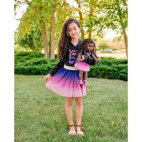 American Girl Boneca e livro World by Us Makena - Boneca Makena com olhos castanhos e cabelo castanho escuro texturizado de comprimento médio que vem em um estilo torcido - Uma saia plissada com estampa ombre rosa e roxa e cintura elástica com glitter - Uma camiseta gráfica preta com o ditado "See me, hear me, know me" - Três presilhas douradas de borboleta - Um par de sapatos rosa - O livro "See Me, Hear Me, Know Me" da Makena que inclui ideias para abordar preconceito racial, perfis de garotas reais e perguntas dos leitores