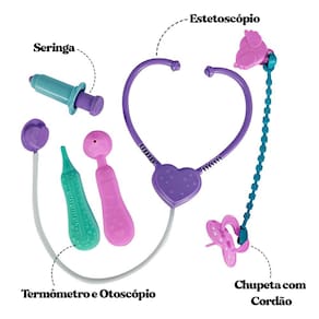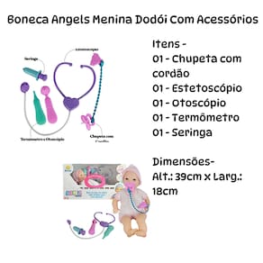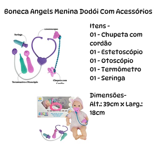 ESPECIFICAÇÕES: Material: Polietileno, Vinil e Roupa em Tecido Dimensões: Alt.: 39cm x Larg.: 18cm Peso: Aprox. 379g A boneca conta com: 01 - Chupeta com cordão 01 - Estetoscópio 01 - Otoscópio 01 - Termômetro 01 - Seringa Registro Inmetro: CE-BRI/IQB 4115 NM 300/2002 Contém: Boneca Angels Collection Fofinha Menina Dodói