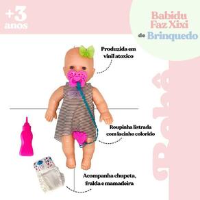 Boneca Babidu Faz Xixi Fralda Quando Bebe água E Acessórios Esta boneca é a companheira perfeita para brincadeiras que ensinam cuidados e responsabilidades de uma forma divertida e envolvente.Com um design fofo, a boneca foi feita para que a criança tenha uma ótima imersão na hora da brincadeira, com um sistema em que quando ela bebe água, ela faz xixi na fraldinha. As crianças vão adorar alimentar a boneca e cuidar dela como se fosse um bebê de verdade, sendo uma maneira incrível de desenvolver habilidades de cuidado, empatia e imaginação enquanto se divertem. Além disso, conta com mamadeira, chupeta e fralda. Feita com materiais de alta qualidade, a boneca possui uma excelente durabilidade, perfeita para ser usada em muitas brincadeiras sem se preocupar com a integridade da boneca A boneca conta com:-01 Mamadeira-01 Fralda-01 Chupeta -Não recomendado para menos de 03 anos por conter partes pequenas que podem sem engolidas ou aspiradas. ESPECIFICAÇÕES: Material: Polietileno, Vinil e Roupa em Tecido Dimensões: Alt.: 33cm x Larg.: 20cm Peso: Aprox. 195g Registro Inmetro: CE-BRI/IQB 4115 NM 300/2002 CONTÉM: 01 BONECA BABIDU FAZ XIXI NA FRALDA QUANDO BEBE ÁGUA E ACESS?-RIOSEsta boneca é a companheira perfeita para brincadeiras que ensinam cuidados e responsabilidades de uma forma divertida e envolvente.Com um design fofo, a boneca foi feita para que a criança tenha uma ótima imersão na hora da brincadeira, com um sistema em que quando ela bebe água, ela faz xixi na fraldinha. As crianças vão adorar alimentar a boneca e cuidar dela como se fosse um bebê de verdade, sendo uma maneira incrível de desenvolver habilidades de cuidado, empatia e imaginação enquanto se divertem. Além disso, conta com mamadeira, chupeta e fralda. Feita com materiais de alta qualidade, a boneca possui uma excelente durabilidade, perfeita para ser usada em muitas brincadeiras sem se preocupar com a integridade da boneca A boneca conta com: -01 Mamadeira-01 Fralda-01 Chupeta -Não recomendado para menos de 03 anos por conter partes pequenas que podem sem engolidas ou aspiradas. ESPECIFICAÇÕES: Material: Polietileno, Vinil e Roupa em Tecido Dimensões: Alt.: 33cm x Larg.: 20cm Peso: Aprox. 195g Registro Inmetro: CE-BRI/IQB 4115 NM 300/2002 CONTÉM: 01 BONECA BABIDU FAZ XIXI NA FRALDA QUANDO BEBE ÁGUA E ACESSÓRIOS Marca: ANJO TOYS Ean: 7891534718645
