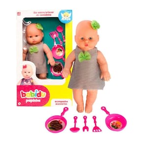 Esta boneca é a companheira perfeita para brincadeiras que ensinam cuidados e responsabilidades de uma forma divertida e envolvente. Com um design fofo, a boneca foi feita para que a criança tenha uma ótima imersão na hora da brincadeira com acessórios de cozinha. As crianças vão adorar cuidar a boneca como se fosse um bebê de verdade, sendo uma maneira incrível de desenvolver habilidades de cuidado, empatia e imaginação enquanto se divertem. Além disso, conta com mini panelas e espátulas. Feita com materiais de alta qualidade, a boneca possui uma excelente durabilidade, perfeita para ser usada em muitas brincadeiras sem se preocupar com a integridade da boneca A boneca conta com: -03 Espátulas -02 Panelas -Não recomendado para menos de 03 anos por conter partes pequenas que podem sem engolidas ou aspiradas. ESPECIFICAÇÕES: Material: Polietileno, Vinil e Roupa em Tecido Dimensões: Alt.: 33cm x Larg.: 20cm Peso: Aprox. 195g Registro Inmetro: CE-BRI/IQB 4115 NM 300/2002 CONTÉM: 01 BONECA BABIDU PAPINHA COM ACESSÓRIOS DE COZINHA