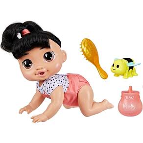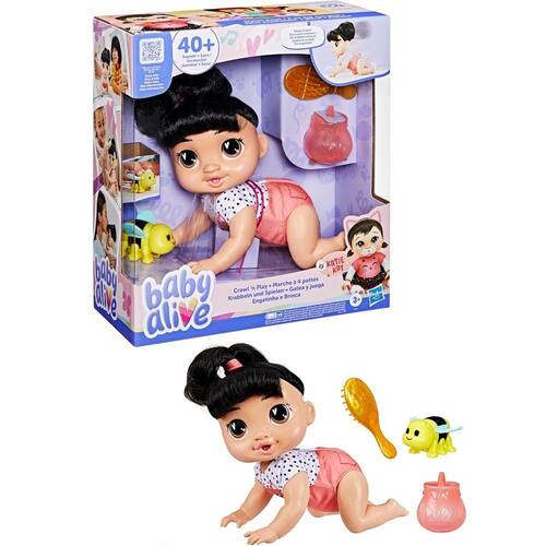 O kit Baby Alive Engatinha e Brinca traz uma boneca que engatinha de verdade. Basta apertar o botão nas suas costas para ver a boneca engatinhar e emitir sons adoráveis. Ela possui 27 cm e emite mais de 40 sons diferentes, incluindo uma música divertida. Basta encostar a mamadeira na sua boca para que a boneca emita sons de comidinha. Esta boneca vem com uma escova para pentear os seus cabelos.