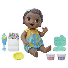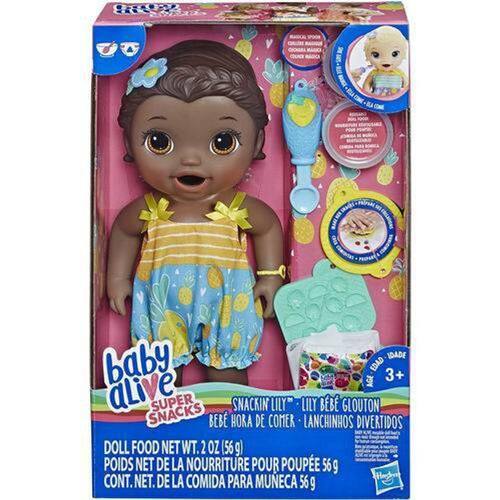Atualizando as estampas das roupas, acessório para o cabelo, cores acessórias + enfeites para os olhos Lanchinhos Divertidos (Snackin Lily) é uma menininha com um grande apetite! Ela adora comer a comidinha que vem no aviãozinho; sempre funciona Parte da linha Super Snacks, a Lanchinhos Divertidos (Snackin Lily) faz lanchinhos de comida sólida para boneca É possível criar lanchinhos de frutas e usar a colher especial para dar comidinha a ela Então chega a hora de trocar a fralda! A Lanchinhos Divertidos (Snackin Lily) vem com roupa removível, 2 potes de comida reutilizável para boneca, uma colher, um prato, um molde para fazer os lanchinhos e uma fralda