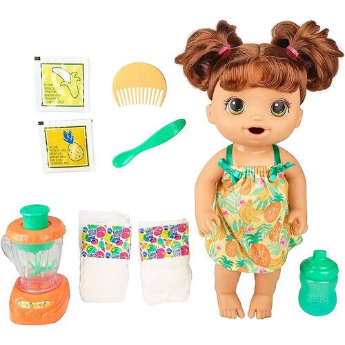 É muito divertido fazer papinhas para sua bebê com o liquidificador que funciona de verdade!! Basta abrir o sache, colocar no liquidificador com três colheres de sopa de água e apertar o botão para fazer a comidinha da sua bebê. A Baby Alive acompanha uma mamadeira, um liquidificador, dois saches, duas fraldas, uma colher e um pente lindo para poder pentear os cachinhos da sua bebê!! A bebê está pronta para a hora do lanchinho.