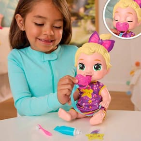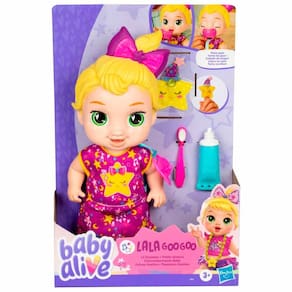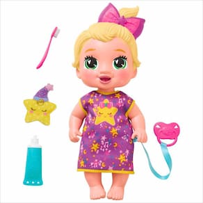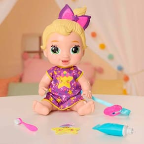 Boneca - Baby Alive - Pequenos Sonhos - Lala Goo Goo - Hasbro: as crianças podem brincar de preparar essa linda Boneca de 28 cm para a hora de dormir. A boneca fecha os olhos quando recebe a chupeta. A chupeta fica presa ao pijama para não se perder. As crianças podem contar lindas histórias com a marionete de dedo em formato de ursinho e brincar de escovar os dentes com a escova e a pasta de faz de conta. Detalhes: • Perfeito para brincar de festa do pijama: é hora de dormir para Lala Goo Goo e ela precisa da ajuda da sua pequena para se preparar! Brinque de escovar os dentes, de dar a chupeta ou de contar histórias divertidas • Olhos abrem e fecham: coloque a chupeta na boca para fazer os olhos dela fecharem! A chupeta é presa à roupa para que este Boneca sempre a tenha ao seu lado • Amigo fantoche de dedo: brinque de faz de conta e conte histórias para a hora de dormir com o acessório de fantoche de dedo em forma de estrelinha de tecido • 28 cm de altura: a boneca de corpo duro tem pijamas adoráveis e aconchegantes, braços e pernas articuláveis e cabelo de plástico Informações: • Produto: Boneca Baby Alive Pequenos Sonhos • Marca: Hasbro • Coleção: Baby Alive • Linha: Baby Alive Pequenos Sonhos • Personagem: Lala Goo Goo • Tipo: Boneca Bebê com Acessórios • Categoria: Bonecas e Cia • Tamanho: 28 cm (altura) • Conteúdo: - 01 Boneca com chupeta e óculos presos - 01 Fantoche de dedo - 01 Escova de dentes - 01 Pasta de dentes • Recomendação: para crianças a partir de 03 anos de idade Especificações: • Modelo: Baby Alive Pequenos Sonhos Lala Goo Goo Loira • Referência: F9856 • Código de Barras: 5010996243720 • Embalagem (C x A x L): 23 x 35 x 10 cm • Embalagem (Peso): 0.404 kg • Material / Composição: Plástico, Vinil e Tecido • Registro: 002515/2021 • Certificado: Órgãos Autorizados - OCP´S (Organismos de Certificação de Produtos) Aviso: • As imagens são meramente ilustrativas • Os pesos, tamanhos e medidas são aproximados • As cores e estampas dos produtos podem ter variações • As informações são de responsabilidade do fabricante ou fornecedor