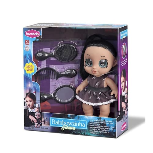 Uma bonequinha bem diferente, com seu jeito sombrio que a torna tão envolvente. Rainbowzinha, a princesinha macabra que encanta a todos com seu charme peculiar vem com pente, espelho e escova, para você fazer lindos penteados