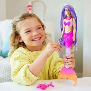 Explore histórias e aventuras marítimas com a Barbie Fantasia Sereia Cores Mágicas Cabelo Roxo, estimulando a imaginação e o desenvolvimento das crianças.