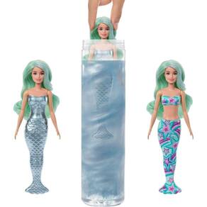 As bonecas Barbie Color Reveal proporcionam uma experiência cheia de surpresas. As crianças encontrarão uma das quatro bonecas exclusivas desta série de sereias - cada uma com cabelos longos com listras brilhantes que mudam de cor. Qual boneca você vai revelar Retire a camada externa da embalagem, abra o tubo e retire uma boneca Barbie fashion, cujo visual de sereia é coberto por um revestimento Color Reveal e bolsas surpresa. Os acessórios incluem barbatana caudal removível, colar com pingente de mar, faixa para a cabeça e pente de concha. Utilize o tubo da embalagem para guardar essas e outras peças.