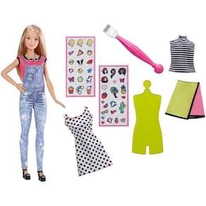 Crie lindas roupas para a Barbie com estes conjuntos de estilista, inspirados em emoticon! Criar roupas é muito fácil. Escolha uma roupa e coloque-a na forma. Depois, crie seu design de emoticon. Escolha um, dois ou mais entre os 40 decalques inclusos e coloque o filme transparente do decalque sobre a roupa. Use a ferramenta para esfregar sobre o filme, depois remova-o, revelando um decalque permanente na roupa. Vista a Barbie® com looks criados por você, e complete a produção com o par de sapatos e o colar que estão inclusos. Boneca não incluída.