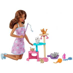 O que está na caixa Inclui boneca Barbie , 1 gato, 4 gatinhos, 1 mamadeira, 1 escova, 1 novelo de luz e 1 érvore para gatos com 1 corda, 1 teaser e 1 cesta.