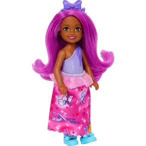 - Inspire histórias mágicas com esta boneca Barbie Chelsea vestida como uma realeza. Ela é fofa como pode ser em tons de rosa e roxo!