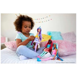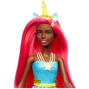 Bonecos de unicórnio da Barbie Dreamtopia dão vida a sonhos de contos de fadas com olhares fantásticos e uma transformação mágica Esta boneca Barbie usa um corpete brilhante e uma saia removível com uma estampa estrelada. As crianças podem adicionar uma faixa de cabeça de unicórnio e cauda de encaixe para transformar a boneca Barbie em um unicórnio brilhante como arco íris Cabelos de fantasia, listrados em rosa e amarelo, sapatos coloridos e meias calças pintadas completam seu visual fantástico. Com tantos toques divertidos de contos de fadas, as bonecas de unicórnio Barbie Dreamtopia fazem ótimos presentes para crianças de 3 anos ou mais