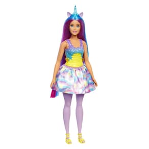Descubra um mundo mágico com a Barbie™ Dreamtopia Unicórnio! A Barbie® tem um visual vibrante com cabelos azuis e roxos, corpete brilhante e saia removível com estampa de nuvens e arco-íris. Com cauda de encaixe e tiara brilhante de unicórnio com orelhinhas, as crianças transformam a Barbie® em uma criatura saída diretamente dos contos de fadas! Os sapatos coloridos e as meias-calças pintadas inspiram ainda mais diversão. Com visuais vibrantes e uma transformação fantástica, a Barbie™ Dreamtopia Unicórnio inspira contos de fadas para crianças a partir de 3 anos. Vendidos separadamente, sujeitos a disponibilidade. A boneca não fica em pé sozinha. As cores e as decorações podem variar.?