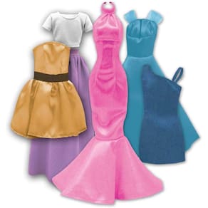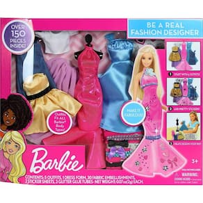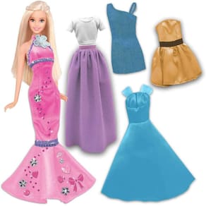 PRODUTO INTERNACIONAL. Torne-se estilista com este divertido kit de boneca de moda Barbie! Transforme 5 vestidos simples em modas FABULOSAS aplicando fitas, arcos, flores, lantejoulas, cola de glitter e enfeites variados! Todos os vestidos são dimensionados para caber bonecas Barbie.