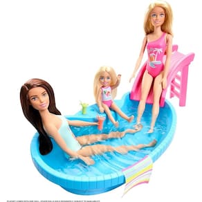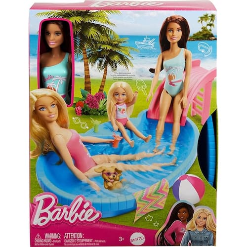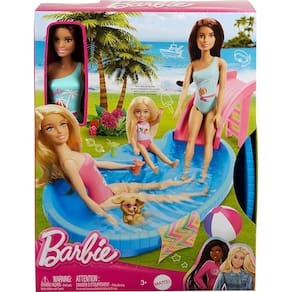 A boneca Barbie vem com tudo o que ela precisa para uma tarde de verão perfeita: piscina, escorregador e acessórios