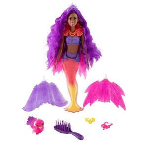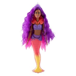 ?A Barbie® tem um visual mágico de sereia, com cabelos longos roxos e uma bela cauda ombré com toques de alta qualidade e escamas esculpidas.
