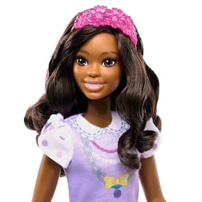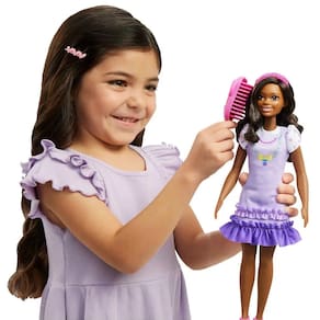 Bem-vindos ao encantador mundo da Minha Primeira Barbie™, onde amizades começam e imaginações criam asas! Crianças em idade pré-escolar podem brincar, aprender e crescer com bonecas e conjuntos Minha Primeira Barbie™. Esta Barbie® "Brooklyn" Roberts de 34 cm é inspirada na personagem da série do YouTube Minha Primeira Barbie™. Tronco e membros macios facilitam na hora de brincar, levar por aí e vestir. Seu vestido lilás adorável tem estampa de colar, mangas bufantes com bolinhas e bainha com babados. Ela usa uma faixa de cabelo texturizada e sapatos cor de rosa que dão o tom para brincadeiras com estilo! Fechos simples facilitam brincadeiras de vestir para mãos pequenas, criando momentos divertidos e fáceis com a moda. A Barbie "Brooklyn" tem cabelo preto ondulado. As crianças podem usar a escova grande para pentear e modelar seu cabelo, o que pode ajudar a desenvolver destreza e ensinar sobre cuidados pessoais! Vem com poodle de pelúcia estampado para acompanhar em aventuras e inspirar cuidados. Tem até uma guia que prende ao redor das mãos da boneca para que ela possa levar seu bichinho adorável de apertar onde quiser! Perfeita para crianças em idade pré-escolar, Minha Primeira Barbie™ é uma coleção nova que encoraja as jovens mentes a explorarem histórias de amizade e brincadeiras com moda! As crianças podem colecionar todas as bonecas para criar doces momentos com suas melhores amigas.