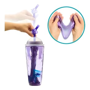 As crianças Retiram a Camada Externa da Embalagem, Abrem o Copo e Retiram Os Sacos Surpresa, Depois Rosqueiam a Tampa Novamente e Abrem a Parte Superior com o Pedaço em Forma de Canudo Para Liberar a Gosma Rosa e Fofa Nos Cubos de Gelo.