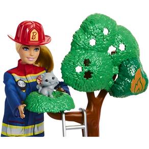 Acompanhe a Barbie neste conjunto de resgate, com brincadeiras com água e mudança de cor, com mais de 10 peças, incluindo uma estação com poste de bombeiro para o filhote, uma árvore, um extintor de incêndio, uma escada, um caminhão de bombeiro para o filhote, um gatinho para resgatar, um fogo que muda de cor e muito mais. A boneca vem vestida com um autêntico traje azul de bombeira com calças, jaqueta, botas e capacete.